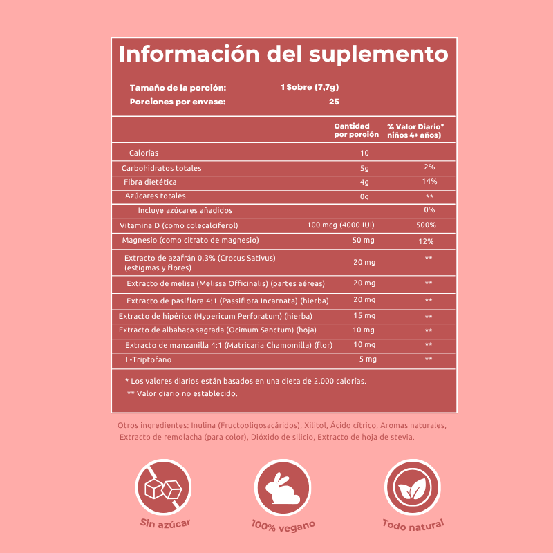 • Extracto de manzanilla (10 mg) – Hierba suave y segura para niños que fomenta la calma y reduce la sobreestimulación.